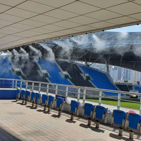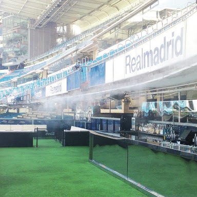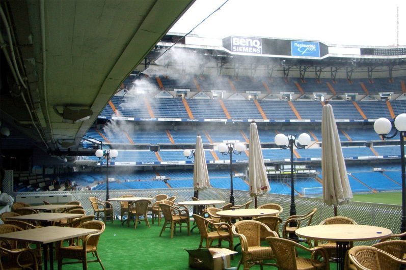 Selbst Zuschauer im Stadion können von einer Abkühlung durch Vernebelungsdüsen profitieren indem man eine solche Anlage auf Premium-Zuschauerplätze anbringt.